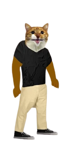 In the animated scenes, he wears a black shirt, yellow pants/trousers and black trainers. In the live-action scenes, he is seen as a real life ginger cat with green eyes. In the first animated scenes, he has his face from Episodes 35 and 36. Starting with Episode 86, Mylo has his iconic face from Episode 1 with an open smiling mouth (even when he talks). Starting with Episode 103, he has an edited almost closed mouth that moves when he’s talking or when he’s not talking (except for when he’s startled or is just in the moment).