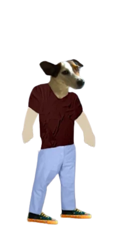 Barry wears a dark red t-shirt, blue trousers/pants and dark turquoise/orange trainers except for the live-action segments where he appears as a normal dog.